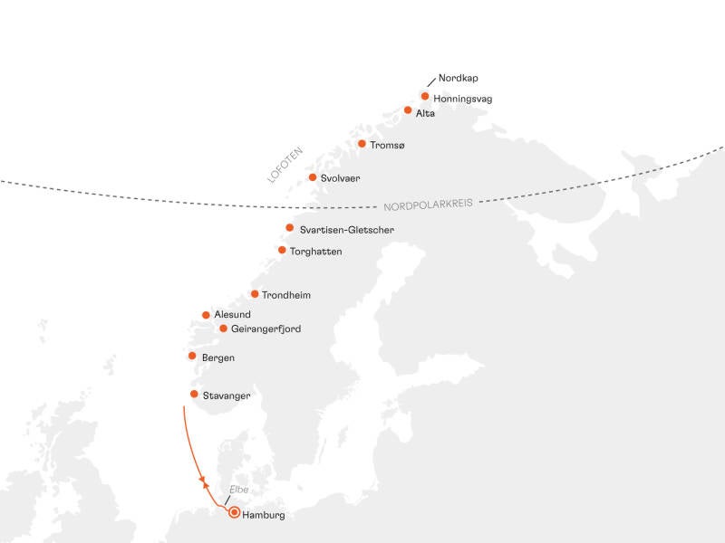 Route: Hamburg – Bergen, Norwegen – Alesund, Norwegen – Torghatten, Norwegen – Tromso, Norwegen – Honnigsvag, Nordkap – Alta, Norwegen – Svolvaer, Lofoten/Norwegen – Svartisen, Norwegen – Trondheim, Norwegen – Geiranger, Norwegen – Stavanger, Norwegen - Hamburg