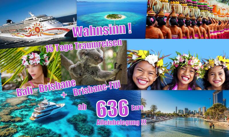 Traumangebote Bali-Brisbane und Brisbane-Fiji zum "fast geschenkt"-Preis für Alleinreisende.